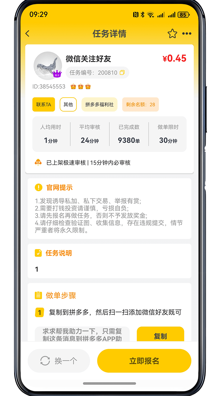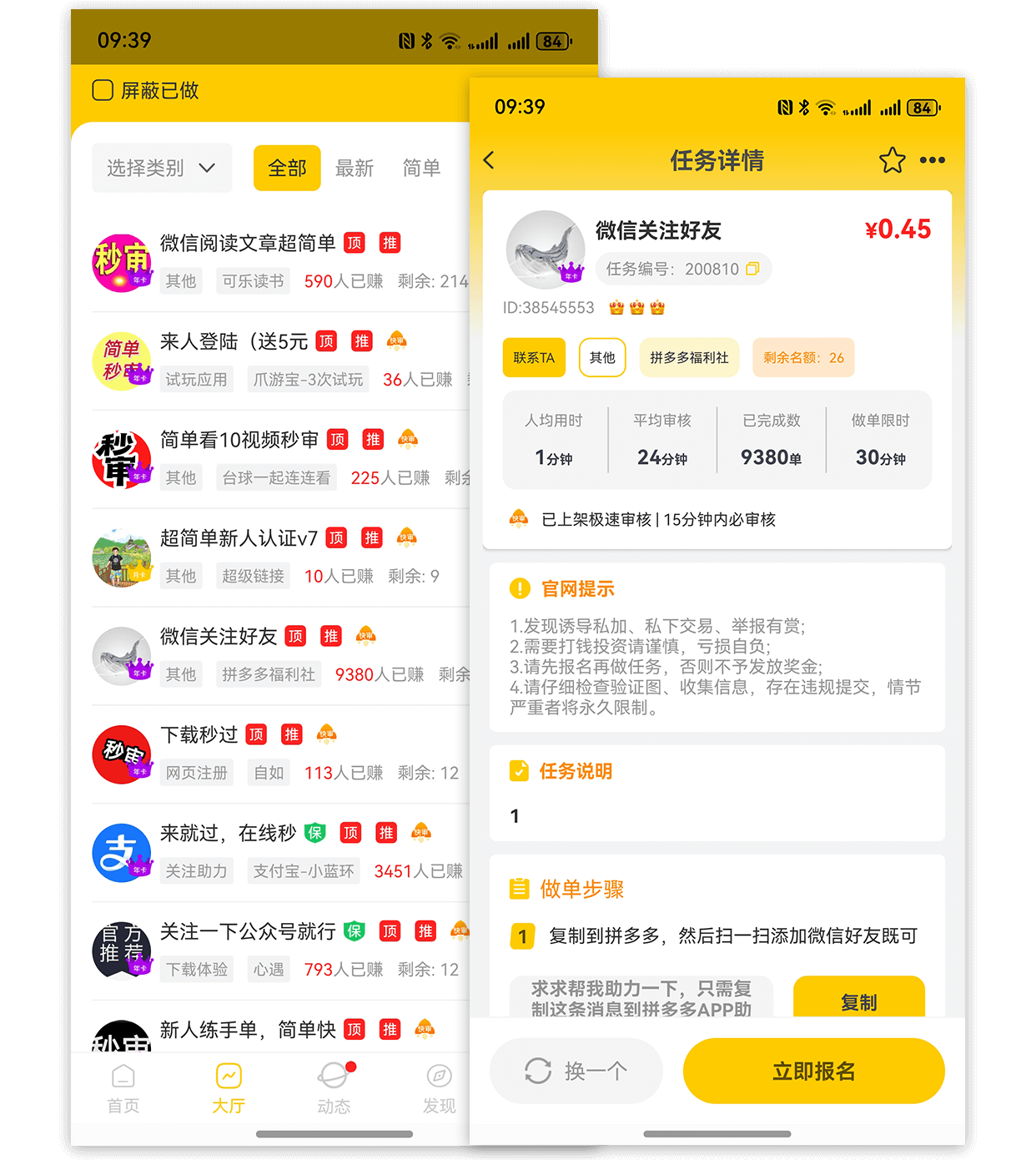 您可将投票、点赞、App体验等需求发布至平台,招募他人协助完成。任务审核极速,最快1分钟即可上线。采用按效果付费模式,确保无效不花钱。